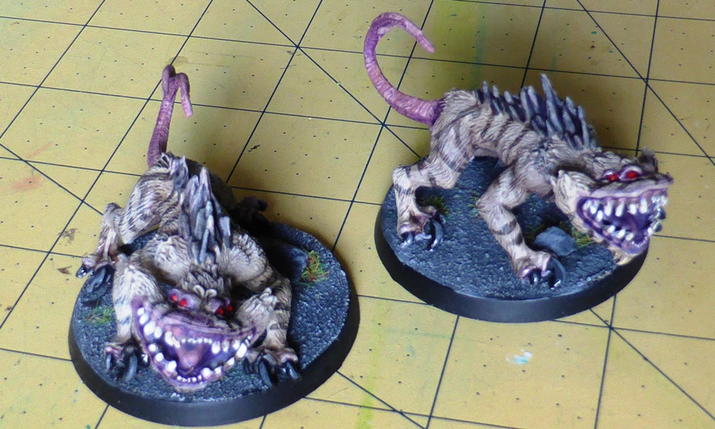 Specifically, I used Games Workshop’s Citadel 50mm round bases, identical in size to the Nexu-bases from the Imperial Assault box, and made simple, unobstrusive grey bases with sand painted with a base coat of Skavenblight Dinge, a dry brush of Administratum Grey and some green Games Workshop flock.