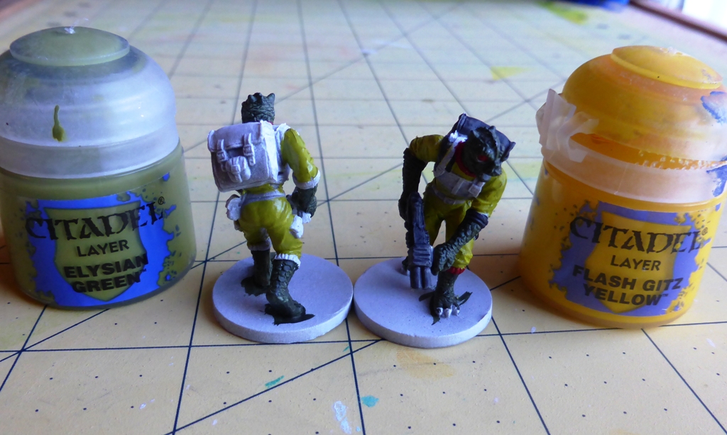 The yellow-green jumpsuit was  highlighted with the abovementioned 50/50 mix, adding more yellow with each step. I also gave it a glaze of Lamenters Yellow.