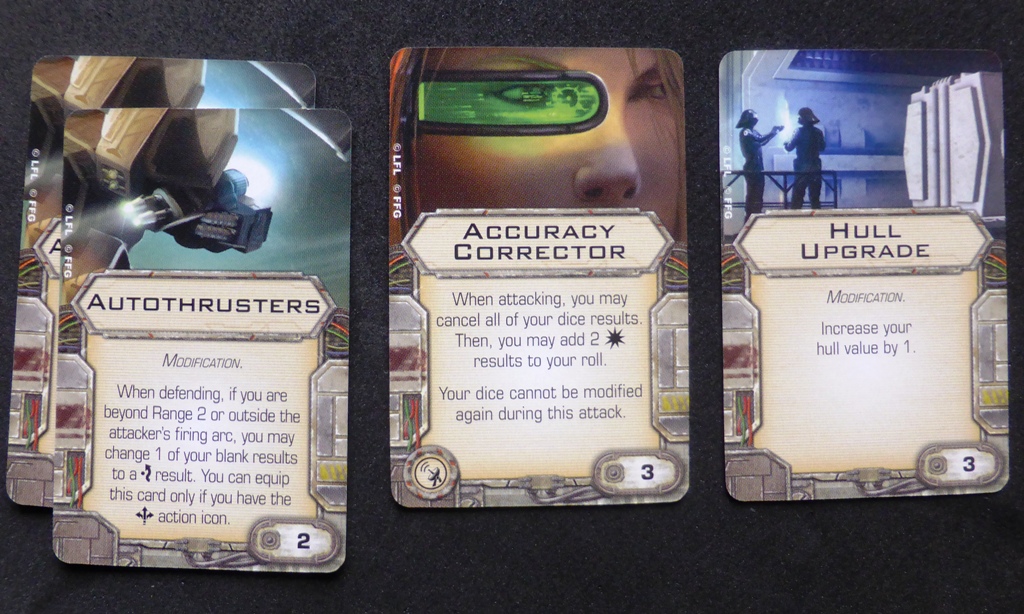 Accuracy Corrector – if Autothrusters are amazing, Accuracy Corrector is a System Upgrade without a place, at the moment. For one, the few ships currently able to take System Upgrades all have plenty of attack dice, making two guaranteed hits less exciting. For another, System Upgrades, rare as they are, include some amazing cards. The Accuracy Corrector is also rather expensive.