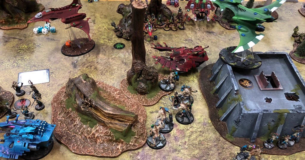 Whoody bewegte einen Teil seiner Armee – Warp Spiders, eine Einheit Fire Dragons, seinen Farseer und eine Wave Serpent in die Spielfeldmitte, während seine Dark Reapers, der Night Spinner und die Flieger auf Distanz bleiben.